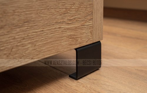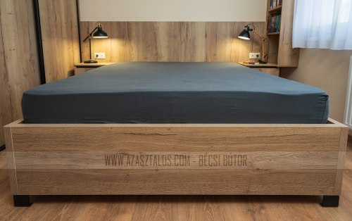 A hálószobába egy stílusos, masszív franciaágy is készült, amely szintén Egger Halifax Natúr Tölgy. Az ágy 160×200 cm méretű matrachoz készült, és felnyíló kialakításának köszönhetően rengeteg tárolóhelyet biztosít, így segít a rend fenntartásában. A fekete matt, designos fém lábak modern és letisztult megjelenést adnak neki. A franciaágy különlegessége, hogy fejtámlája végigfut a szobán keresztben, ezzel összekötve a tér elemeit és egységes stílust teremtve. Az ágy belseje könnyen kiszedhező elemekből áll, így alatta a padló egyszerűen és gyorsan takarítható, nem kell az ágyat mozgatni. Ez tovább növeli a praktikumát.
