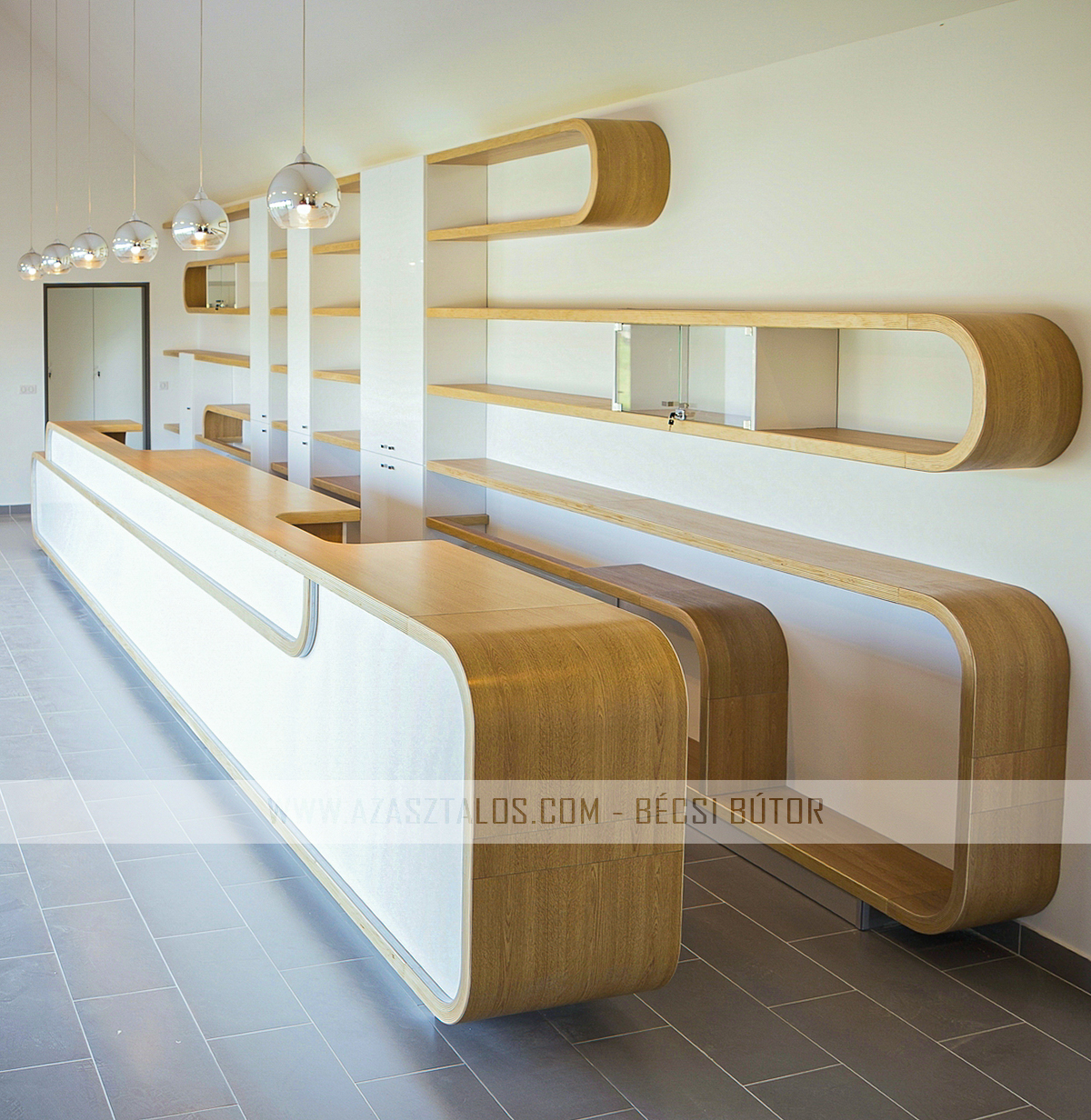 A pult mögötti polcrendszer kialakítása összhangban van a pult dizájnjával, követve annak lekerekített formáit. Ez a koherens tervezés esztétikai egységet teremt a térben, miközben funkcionális tárolóhelyet biztosít.